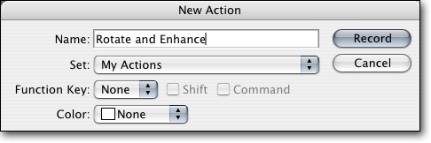 Step 2: You should be prompted to name the new action. See figure 2.1 for an example. I’ve named my Action “Rotate and Enhance.” I’ve tried to be descriptive so when I’m looking for the Action in the future I’m able to pick it out of a list easily.
